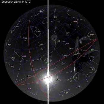 Annotated all-sky camera image from La Palma observatory taken on 2009-09-04 at 23:45:14 UT
