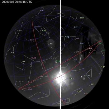 Annotated all-sky camera image from La Palma observatory taken on 2009-09-05 at 00:45:15 UT