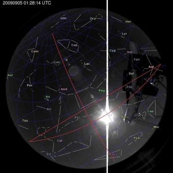 Annotated all-sky camera image from La Palma observatory taken on 2009-09-05 at 01:28:14 UT