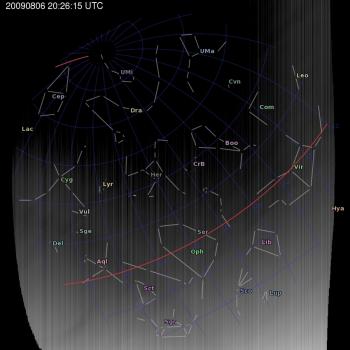 Annotated all-sky camera image from La Palma observatory taken on 2009-08-06 at 20:26:15 UT