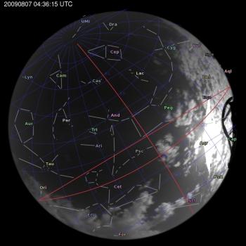 Annotated all-sky camera image from La Palma observatory taken on 2009-08-07 at 04:36:15 UT