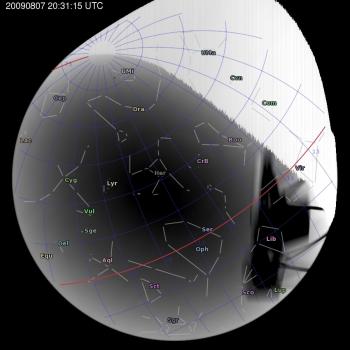 Annotated all-sky camera image from La Palma observatory taken on 2009-08-07 at 20:31:15 UT