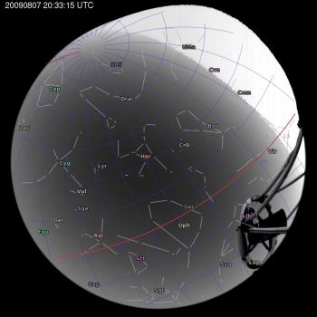 Annotated all-sky camera image from La Palma observatory taken on 2009-08-07 at 20:33:15 UT