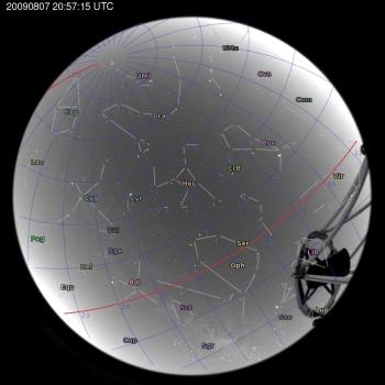Annotated all-sky camera image from La Palma observatory taken on 2009-08-07 at 20:57:15 UT