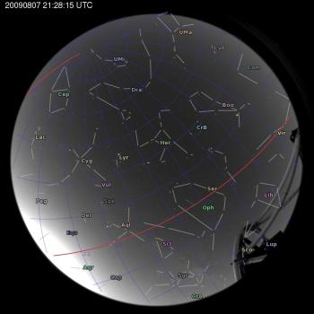 Annotated all-sky camera image from La Palma observatory taken on 2009-08-07 at 21:28:15 UT