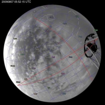 Annotated all-sky camera image from La Palma observatory taken on 2009-08-07 at 05:52:15 UT