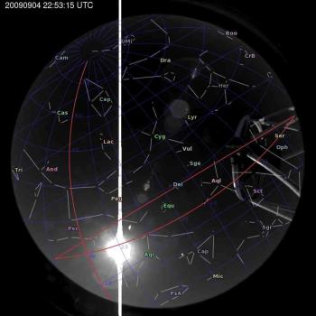 Annotated all-sky camera image from La Palma observatory taken on 2009-09-04 at 22:53:15 UT