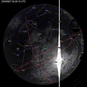 Annotated all-sky camera image from La Palma observatory taken on 2009-08-07 at 02:28:15 UT