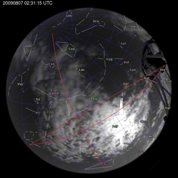 Annotated all-sky camera image from La Palma observatory taken on 2009-08-07 at 02:31:15 UT