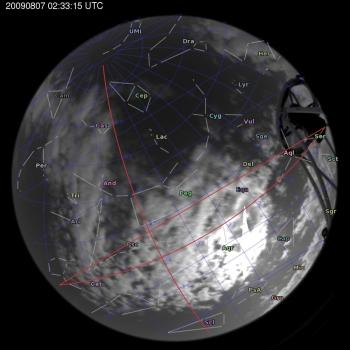 Annotated all-sky camera image from La Palma observatory taken on 2009-08-07 at 02:33:15 UT