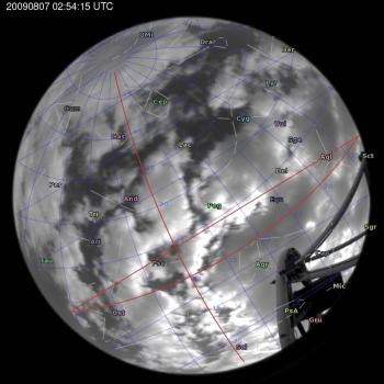 Annotated all-sky camera image from La Palma observatory taken on 2009-08-07 at 02:54:15 UT