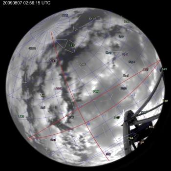 Annotated all-sky camera image from La Palma observatory taken on 2009-08-07 at 02:56:15 UT