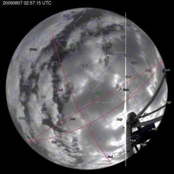 Annotated all-sky camera image from La Palma observatory taken on 2009-08-07 at 02:57:15 UT