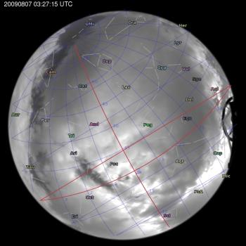 Annotated all-sky camera image from La Palma observatory taken on 2009-08-07 at 03:27:15 UT