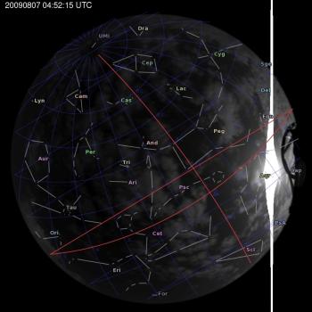 Annotated all-sky camera image from La Palma observatory taken on 2009-08-07 at 04:52:15 UT