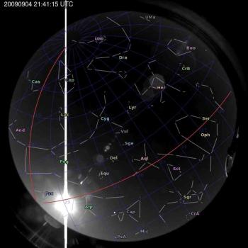 Annotated all-sky camera image from La Palma observatory taken on 2009-09-04 at 21:41:15 UT