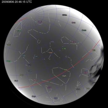 Annotated all-sky camera image from La Palma observatory taken on 2009-08-06 at 20:46:15 UT