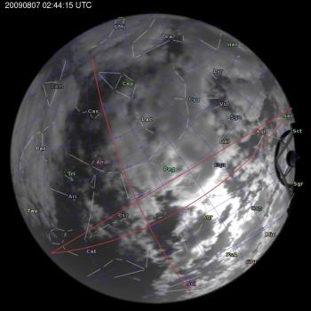 Annotated all-sky camera image from La Palma observatory taken on 2009-08-07 at 02:44:15 UT