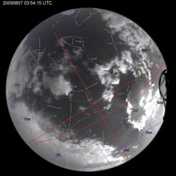 Annotated all-sky camera image from La Palma observatory taken on 2009-08-07 at 03:54:15 UT