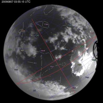 Annotated all-sky camera image from La Palma observatory taken on 2009-08-07 at 03:55:15 UT