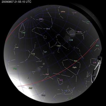 Annotated all-sky camera image from La Palma observatory taken on 2009-08-07 at 21:55:15 UT